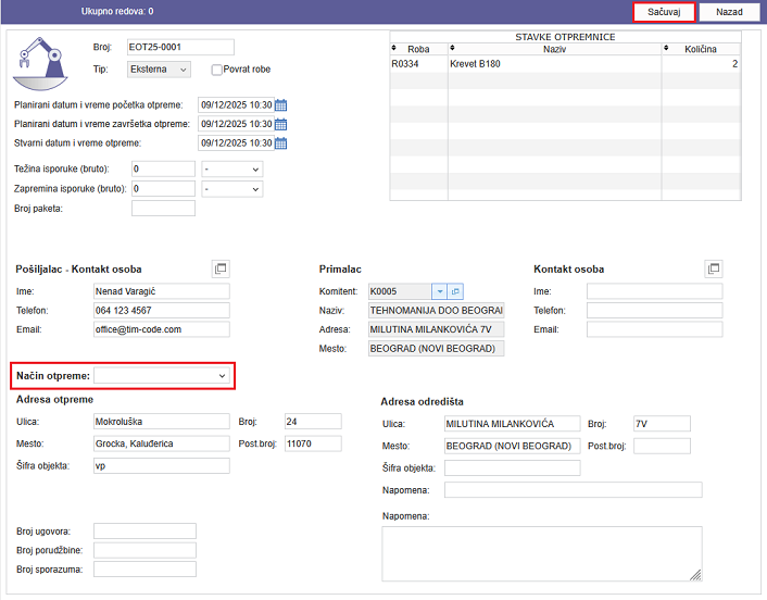 Potrebno je odabrati neku od ponuđenih opcija u polju Način otpreme, proveriti ostale podatke i klikniti na dugme Sačuvaj.
