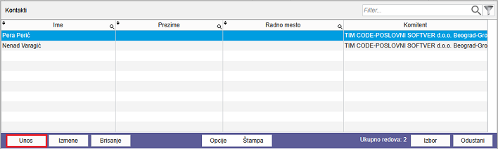 Podaci o kontaktima se mogu upamtiti u Registri -> Kontakti. Kontaktima određenog komitenta se može pristupiti iz Registri -> Komitenti tako što stanete na komitenta koga želite i kliknete na Opcije -> Kontakti.
