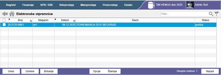 TiM ERP podržava slanje E-Otpremnica direktno iz programa kao i naknadno praćenje njihovih statusa.