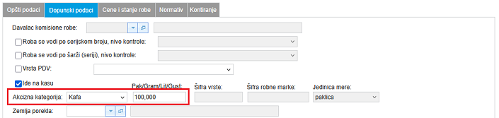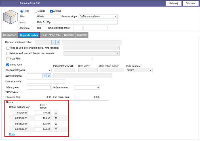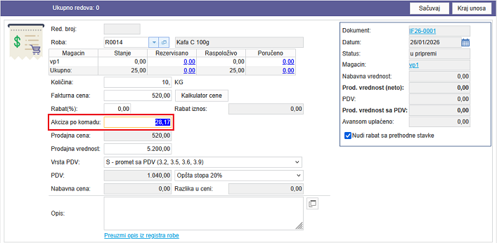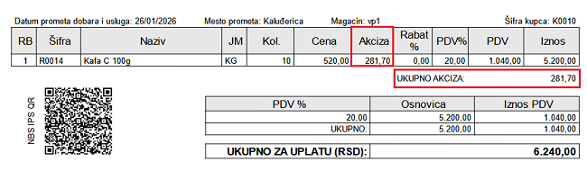 Prilikom kucanja stavke izlaznog računa ukoliko za robu postoji dodeljena akciza program će prikazati novo polje i upuniti vrednost akcize po komadu koja važi na datum računa koji se kuca. Da bi se ovo polje pojavili potrebno je da račun bude iz veleprodaje ili proizvodnje i da je u pitanju domaći račun ili domaći račun sa deviznim cenama.