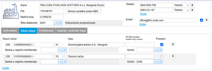 Tekući računi se unose u Registri -> Podaci o Firmi -> Tekući računi.