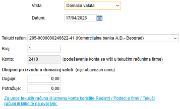 Knjiženjem izvoda program automatski dodaje stavove za duguje i potražuje za konta tekućeg računa (2410, 2440 ili drugi po Vašem izboru).