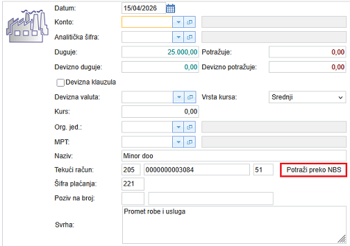 Ukoliko ne postoji postoji otvoren komitent sa tim tekućim računom u registru komitenata možete kliknuti na izmene te stavke, i preko dugmeta "Potraži preko NBS" program će na osnovu tekućeg računa pronaći u NBS koji je to komitent i ponuditi unos u registar komitenata sa svim upunjenim podacima.
