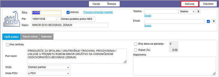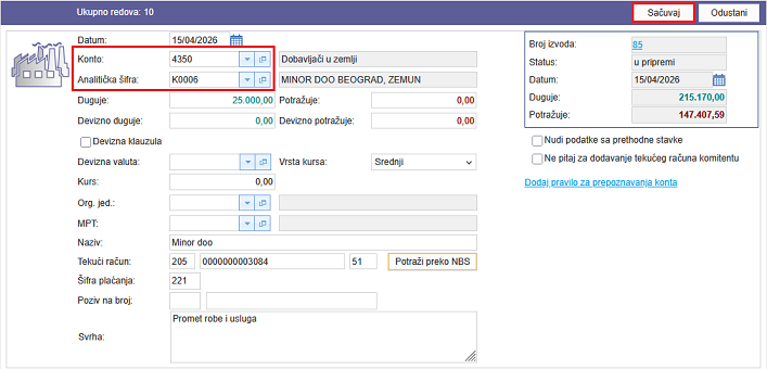 Nakon što kliknete na Sačuvaj program će automatski prepoznati da se radi o kupcu ili dobavljaču i doneti odgovarajući konto, nakon toga samo kliknite na dugme Sačuvaj.
